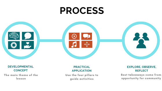 We’ll use the 4-pillar framework of the Learn With Less® Curriculum (play, talk, sing, and move)